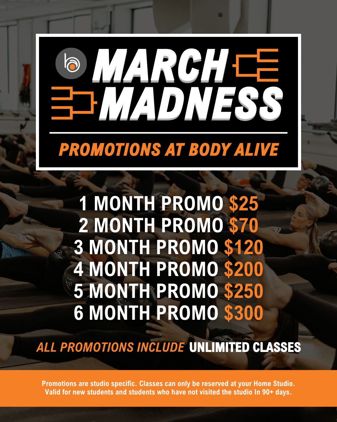 Promotion is not valid for current Unlimited members, students on a class pass, current promotion, or those who have done a promotion or had an active membership within the past 90 days. Your promotion is only active at your Home Studio location for unlimited classes at that single studio location. If you choose to go to another studio, you are eligible to purchase $5 classes for use at other locations. Promotional offers do not include Lagree classes.