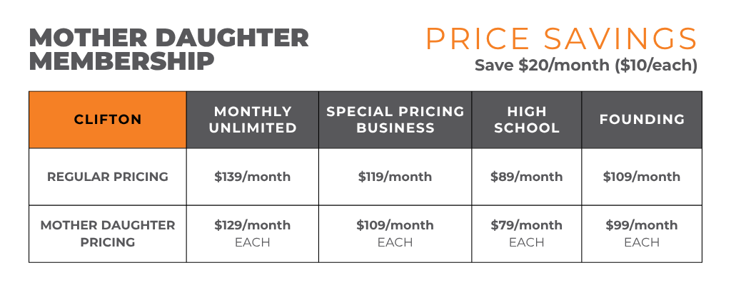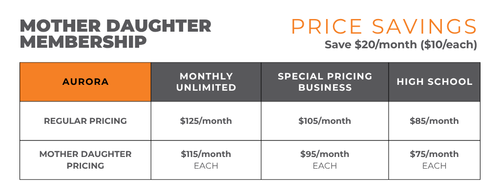 Sign up today and enjoy a $10 discount per person when you and your daughter join together. The $10 savings applies to the membership pricing you each qualify for – including our Regular Monthly Unlimited Membership, Special Pricing Monthly Unlimited Membership, High School Student Membership, and Founding Membership.